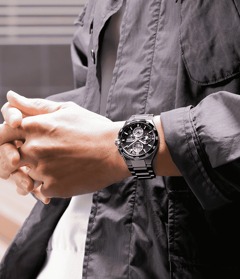 硬質で傷つきにくいセラミックスベゼルとチタン製の飾り縁を組み合わせた二体構造ベゼルに“CHRONOGRAPH”の文字とアラビア数字をマーキングすることで、よりスポーティなデザインに仕上げました。