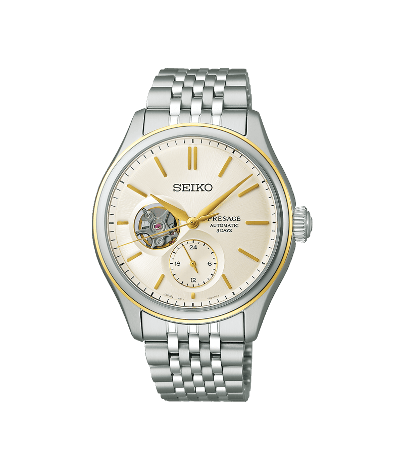 丸みを帯びたカーブダイヤルに、日本人の暮らしを古来より彩ってきた絹のような質感の繊細な型打ち模様を施しました。さらに、インデックスの上面や、秒針と分針の先端も、ダイヤルの球面に合わせて緩やかに曲げました。