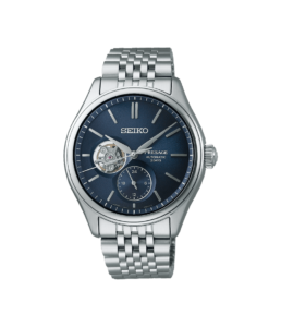 丸みを帯びたカーブダイヤルに、日本人の暮らしを古来より彩ってきた絹のような質感の繊細な型打ち模様を施しました。さらに、インデックスの上面や、秒針と分針の先端も、ダイヤルの球面に合わせて緩やかに曲げました。