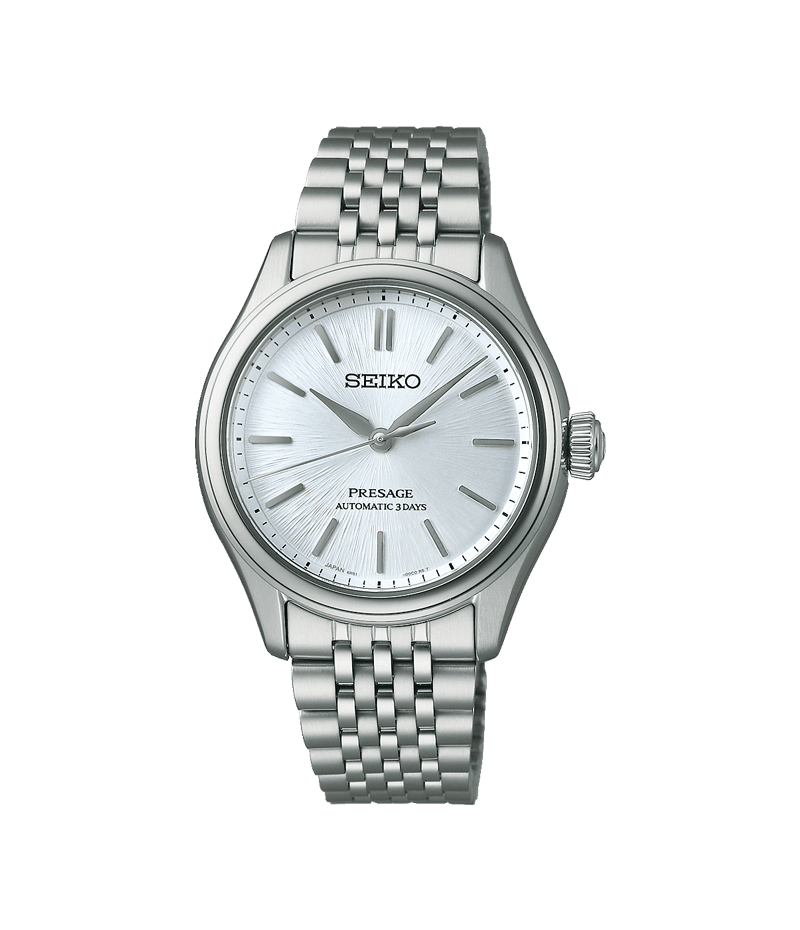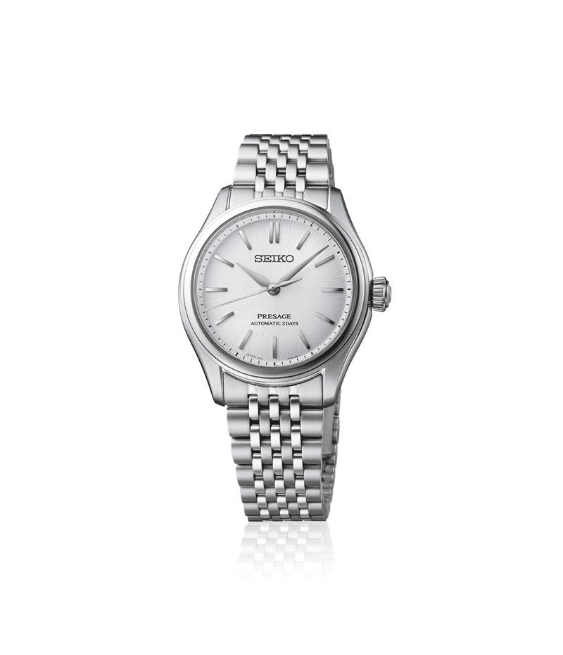 丸みを帯びたカーブダイヤルに、日本人の暮らしを古来より彩ってきた絹のような質感の繊細な型打ち模様を施しました。さらに、インデックスの上面や、秒針と分針の先端も、ダイヤルの球面に合わせて緩やかに曲げました。