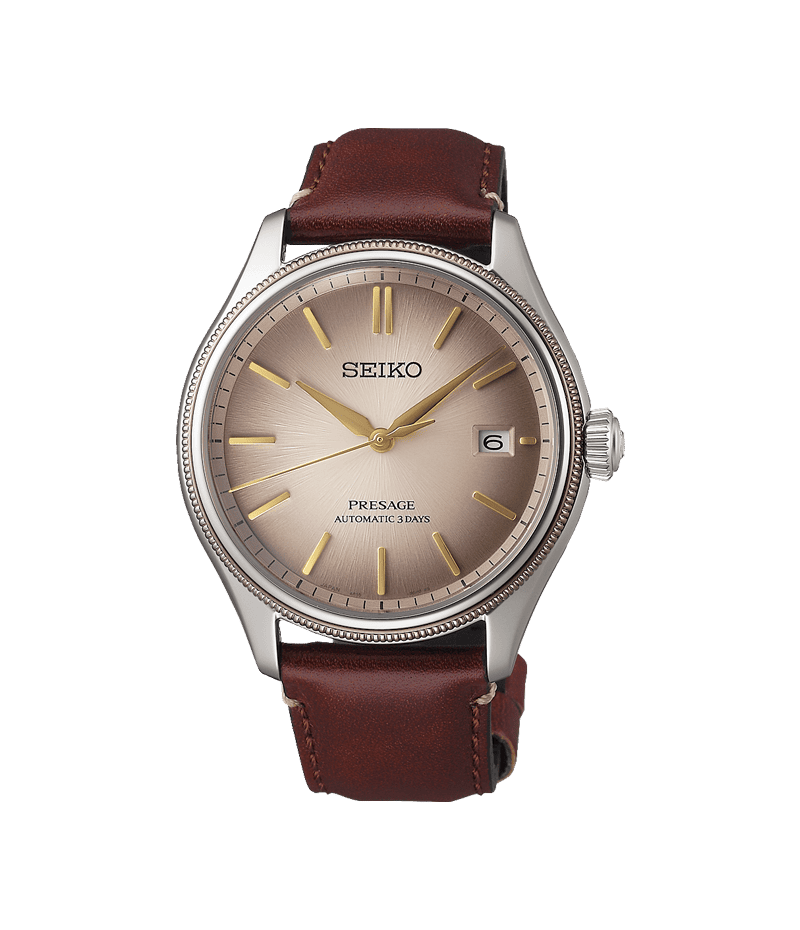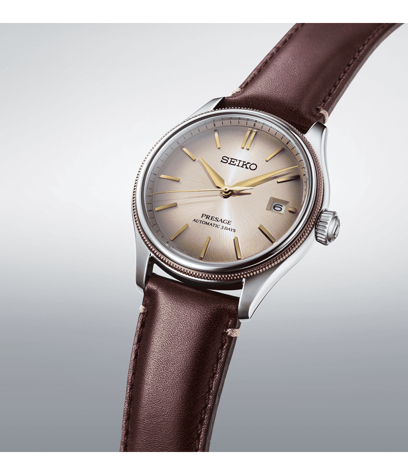 両ブランドが培ってきた匠の技と美意識を融合し、クラシックスタイルを現代的に再解釈しています。ダイヤルには、江戸時代に粋の象徴とされた染め色「白茶(しらちゃ)」を基調とし、柔らかなグラデーションで上品な奥行きを表現。ゴールドの針とインデックスが温もりを添えます。