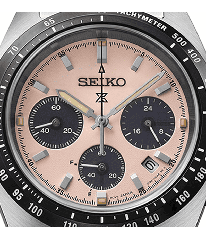1969年に発表した世界初の自動巻クロノグラフ「初代 SPEEDTIMER」の特徴的な造形を継承したソーラークロノグラフ。クラシカルなサイズ感のケース径39mmと質感の高い3列ブレスレット、ボックス風サファイアガラスを組み合わせ、高級時計の佇まいを表現。光の反射を抑える砂目調の型打ちダイヤルで優れた視認性と判読性を両立しました。