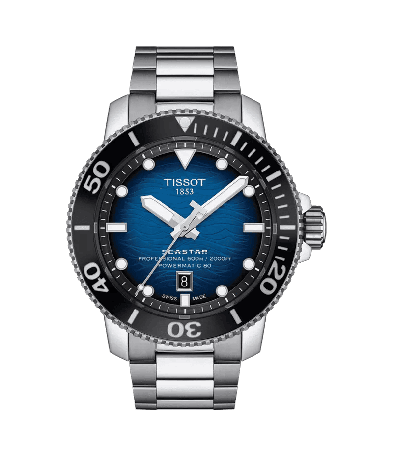 プロダイバーに求められる高い機能性とクオリティを標準装備し、TISSOTのダイバーズウォッチの新たな系譜を築いたTissot Seastar 2000 Professional。素材を贅沢に用い、ステンレススチール自体がもつ強さを活かした堅牢かつ耐衝撃性に優れた仕上がりに加えて、ダイバーズウォッチに欠かせない逆回転防止ベゼルは、濡れた手やグローブをしていてもしっかりとグリップするように設計されているなど、細部にまで徹底したつくりになっています。また、深海での過酷な条件下で長時間作業することを余儀なくされるプロダイバーのために水深100m以上の飽和潜水に対応するべく、9時位置にヘリウムエスケープバルブを搭載しています。
