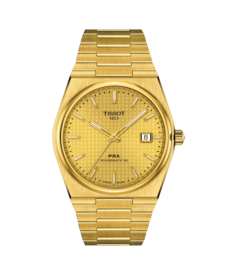 ケース・ブレスレットはもちろん、文字盤・針に至るまでオールゴールドカラーを纏ったTISSOT PRX。