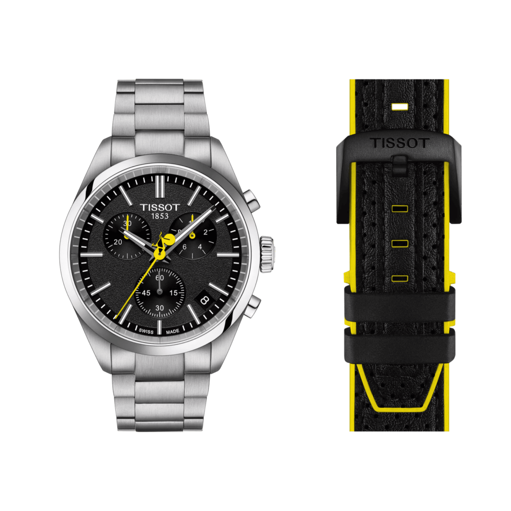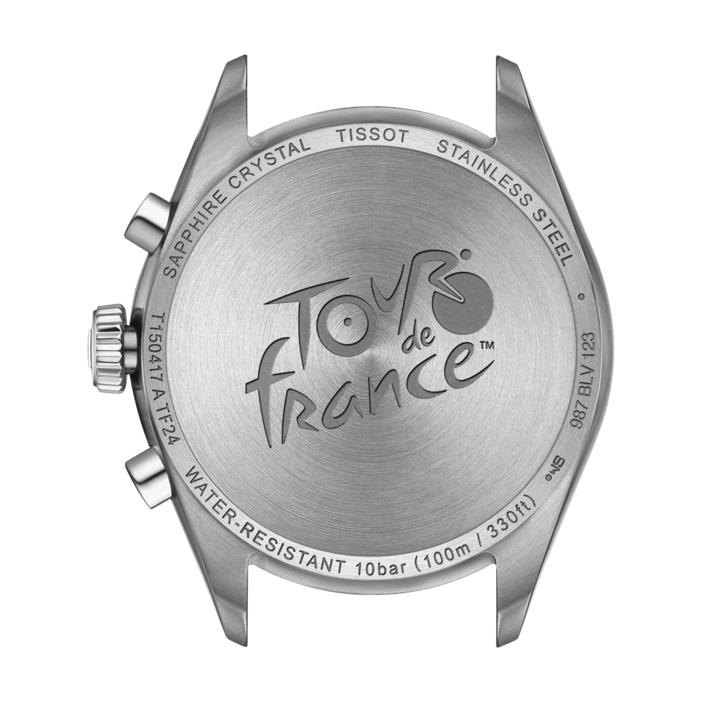 内蔵されたG10.212クロノ・クォーツ・ムーブメントは、10気圧防水を備え、精度と堅牢性を提供。また、針にはスーパールミノバ®コーティングが施され、暗い場所での視認性も保証されています。グラン・トゥールPR100のケースバックには、ツール・ド・フランスのロゴを刻印。PR100の多機能性は、バタフライバックル付きの3列メタルブレスレットによってさらに高められています。2つの素材を組み合わせたブラックのストラップは、自転車のハンドルグリップのテクスチャーであり、ツール・ド・フランスのカラーに合わせた色使いが特徴です。