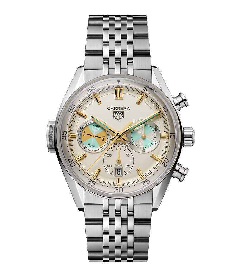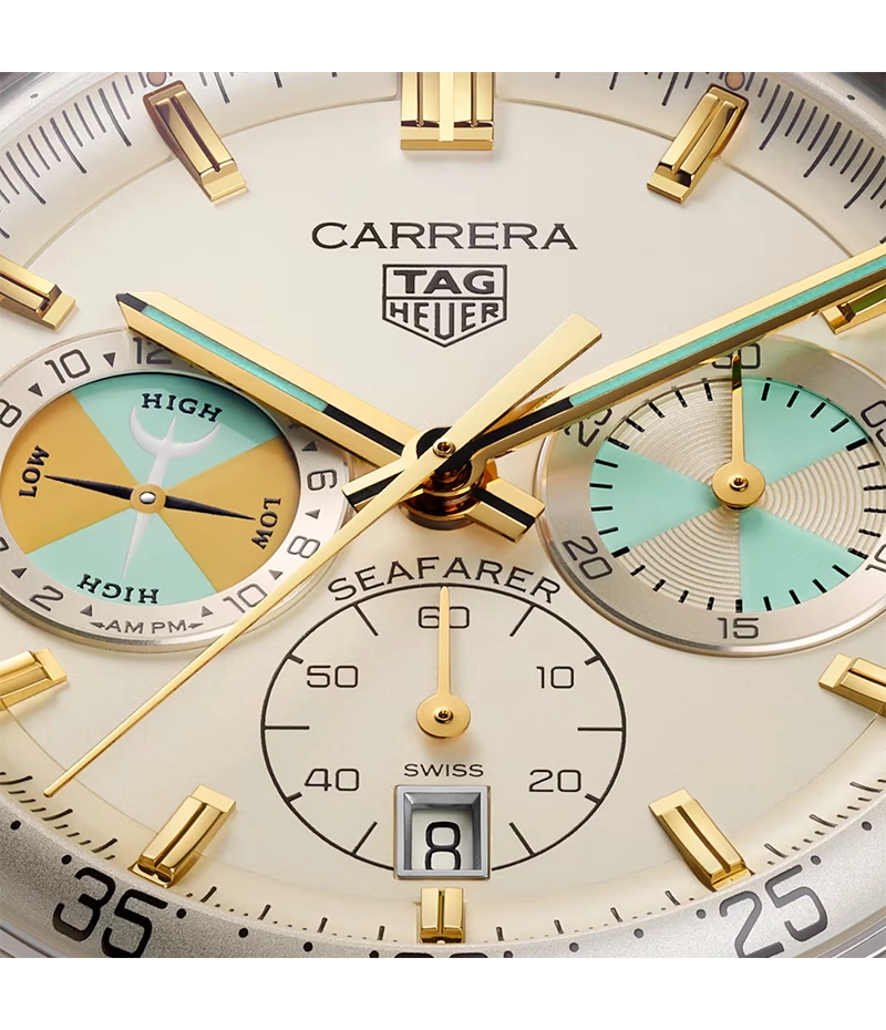 ベージュオパーリンのダイヤルには、アバクロンビー & フィッチ向けに製造された歴史を物語るホイヤー シーファーラー モデルに着想を得た、ティールとイエローのアクセントが組み合わされています。3時位置のカウンターはレガッタ計時にオマージュを捧げるデザイン。9時位置の潮位計は “TIDE” プッシュボタンで操作し次の満干潮の予想時刻を表示します。