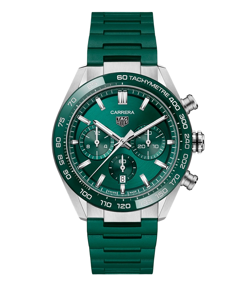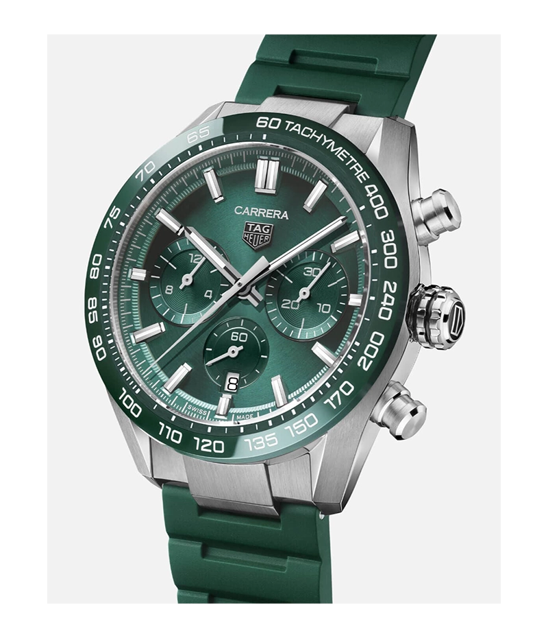 このクラシックなタグ・ホイヤー カレラ クロノグラフは、大胆なグリーンのダイヤルとマッチしたセラミック製ベゼルで、トレンドの魅力を演出しています。