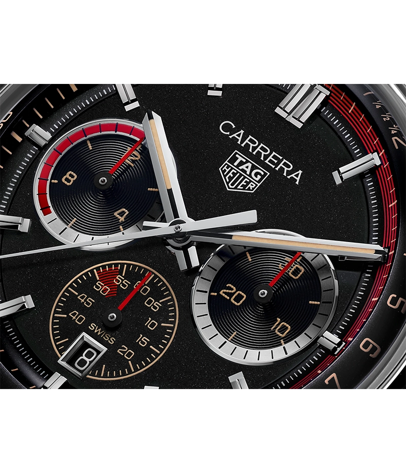 1965年のポルシェ911のデザインにインスピレーションを得た光沢のあるブラックダイヤルに、アイコニックなポルシェのレーシングカーを彩っていた、レッド、ブラック、ベージュのカラーを使ったマーキングがあしらわれています。ダイヤルには、0-100km/h加速 わずか8.4秒という神話的なスピードが表示され、この歴史的レースのスリルを感じさせます。