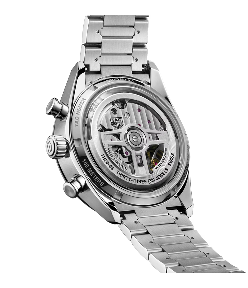 自社製キャリバー ホイヤー02 (TH20-08) クロノスプリント ムーブメントは、ポルシェのステアリングホイールをモデルにしたローターを備え、約80時間のパワーリザーブを蓄えます。ポルシェのエンジンの加速度が描くカーブを模した独自の機構をもち、針はダイヤル上を急加速した後に徐々に減速します。レーススタート時のスリルを感じさせるメカニズムです。