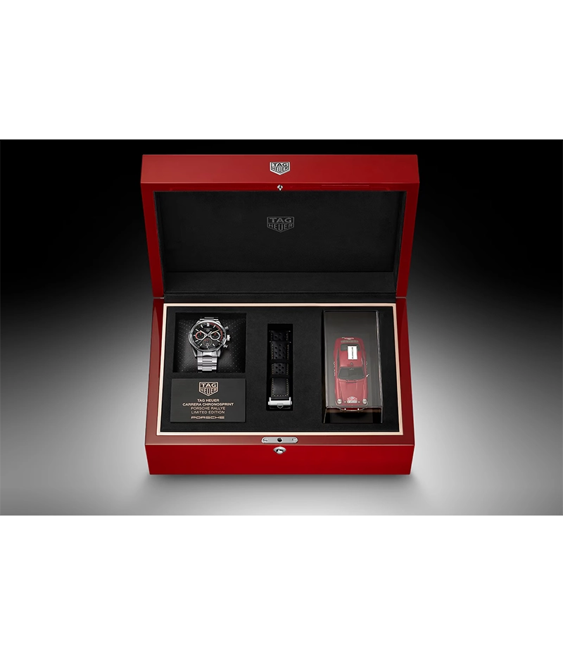 このリミテッドエディションが収められているのは、交換用のブラック レザーストラップと、アイコニックなポルシェ911のミニチュアモデルを同梱した、専用のボックス。モーターレースファンとコレクターにとってのマストハブです。