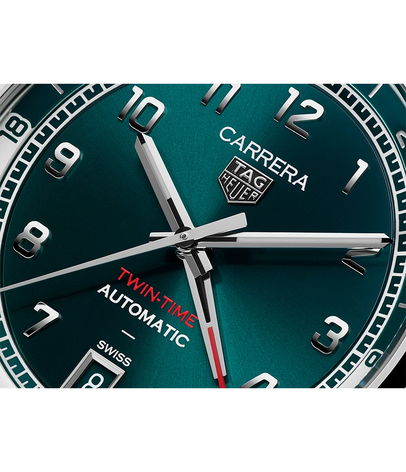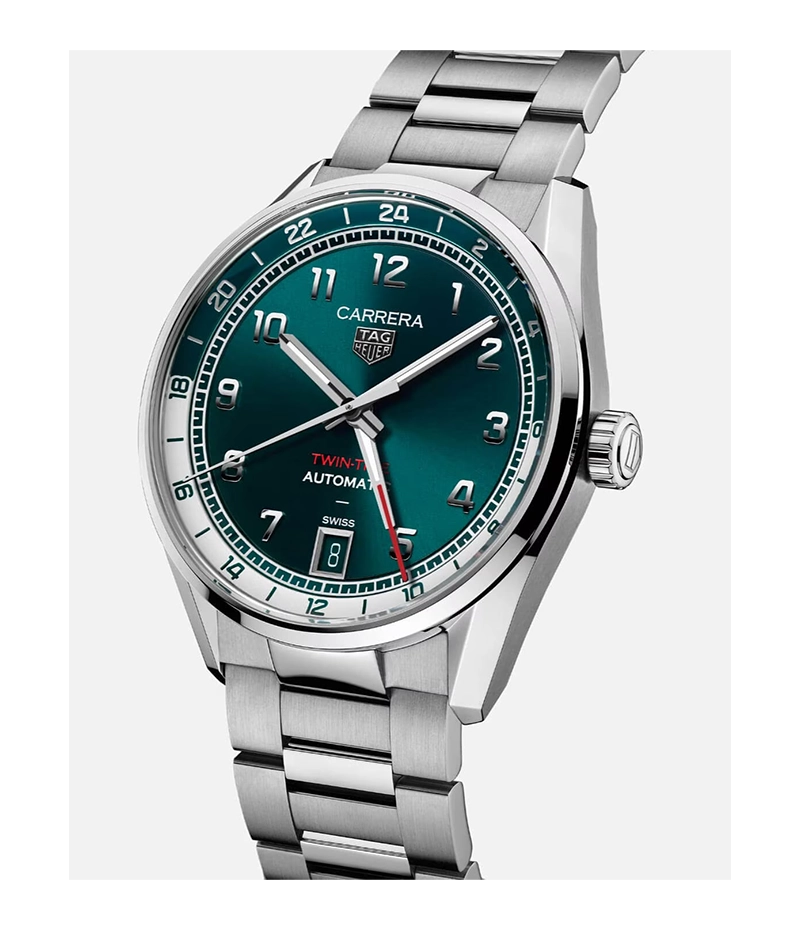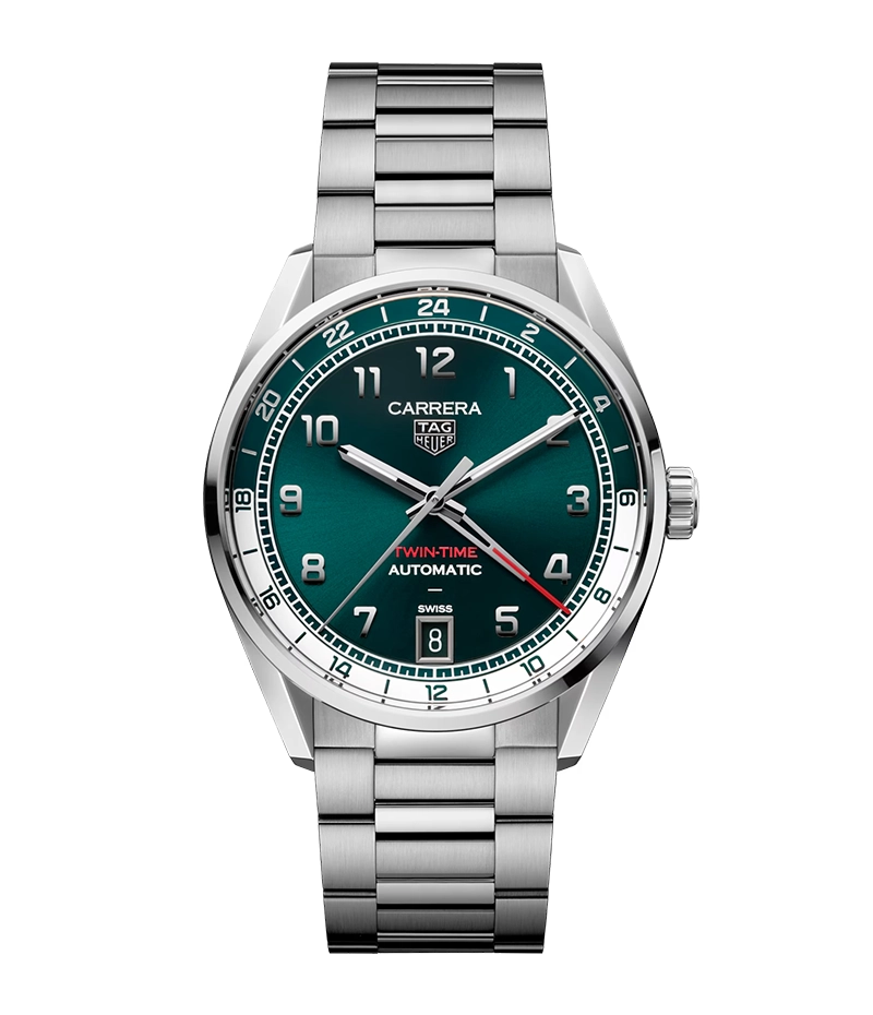 41mmサイズのコレクションを完成させるのは、特徴的なティールグリーンを纏い、GMTコンプリケーションを備えるタグ・ホイヤー「カレラ デイト ツインタイム」。伝統的なデザインと現代的な洗練を融合させています。