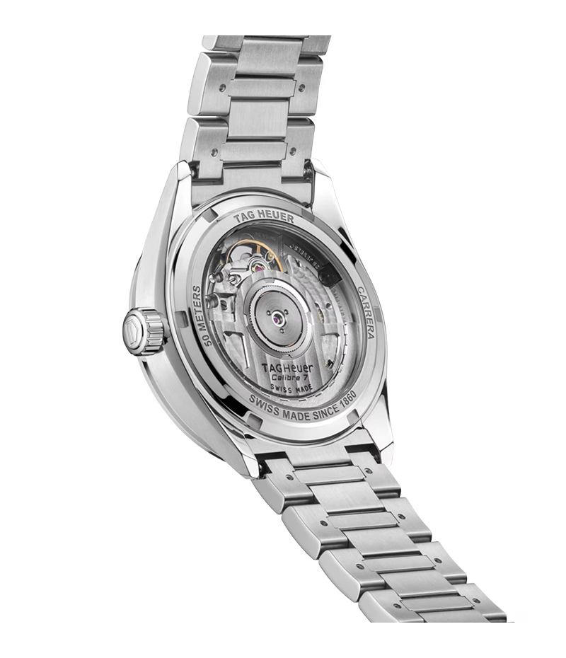 自動巻ムーブメント キャリバー7を搭載し、約50時間のパワーリザーブを実現。6時位置の傾斜のついた日付表示が、実用性を確保しながら妥協のない美学を物語ります。