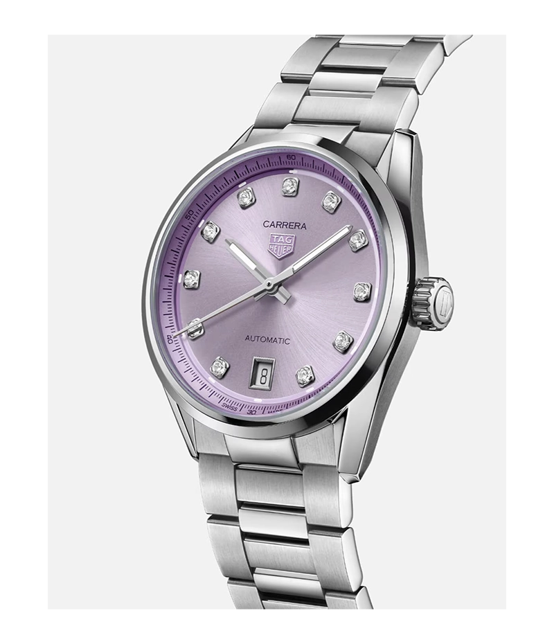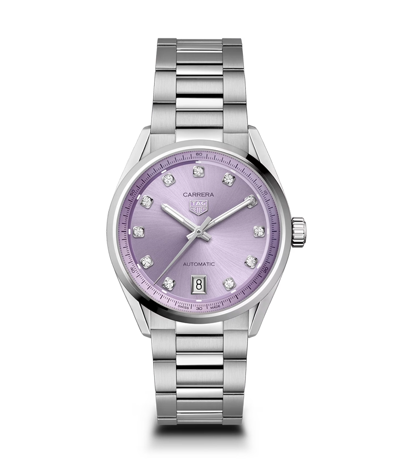 魅惑的なライラックカラーダイヤルでコレクションに新鮮なタッチをもたらす36mmのタグ・ホイヤー「カレラ デイト」。エレガンスと高精度を兼ね備えたタイムピースです。