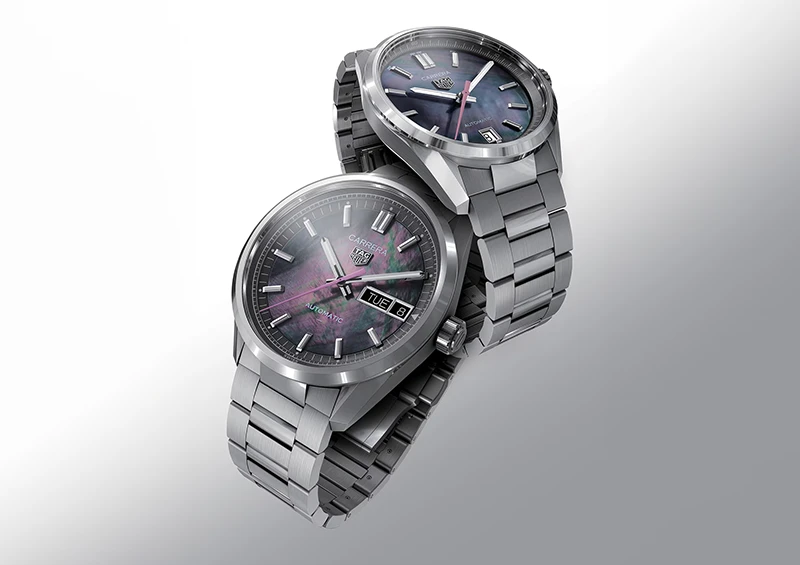 桜から着想を得た日本限定モデル タグ・ホイヤー「カレラ デイデイト ジャパン リミテッドエディション」。ブラックマザーオブパール(黒蝶貝)のダイヤルは光の加減や見る角度によって幻想的な輝きを放ち、ピンクの秒針をポイントとしてあしらっています。
