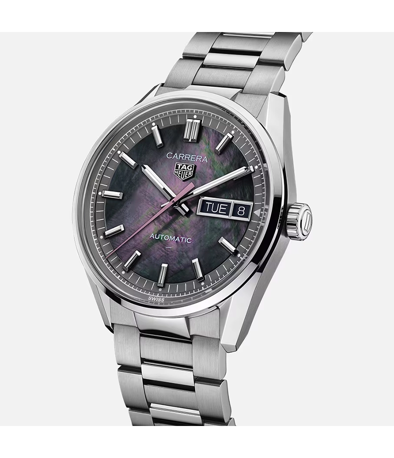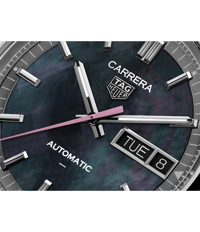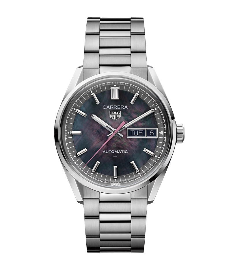 桜から着想を得た日本限定モデル タグ・ホイヤー「カレラ デイデイト ジャパン リミテッドエディション」。ブラックマザーオブパール(黒蝶貝)のダイヤルは光の加減や見る角度によって幻想的な輝きを放ち、ピンクの秒針をポイントとしてあしらっています。