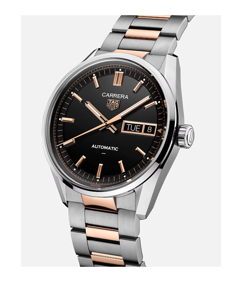 タグ・ホイヤー「カレラ デイデイト」から、ステンレススチールとサテン仕上げを施した18K 5N ゴールドのバージョンが登場。コレクションに洗練されたタッチを加えています。