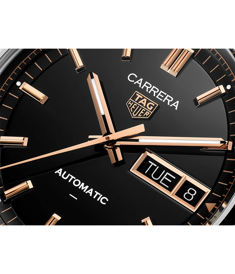 ブラック オパーリン ダイヤルには、18K 5N ローズゴールドプレートのインデックスと針が組み合わされ、ラグジュアリー感を演出。ポリッシュ仕上げのステンレススチール製ケースがコントラストを添え、このウォッチの個性を放っています。ケースバックには、成功のシンボルとしてのカレラのレガシーを永遠のものとする、“ビクトリーリース”が刻印されています。