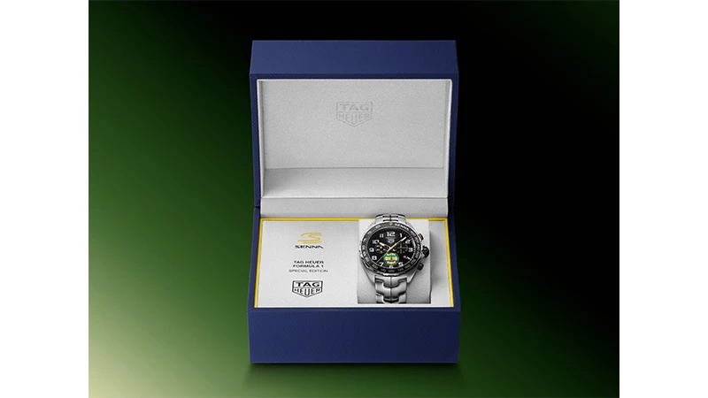 サテン & ポリッシュ仕上げを施した43mmのステンレススチール製ケースには、セナのロゴがあしらわれたブラックのアルミニウム製タキメーター付きベゼルが合わせられています。ステンレススチール製のねじ込み式ケースバックには特別な刻印が施され、タグ・ホイヤーとモーターレーシングのレジェンドとの強い絆を強調しています。