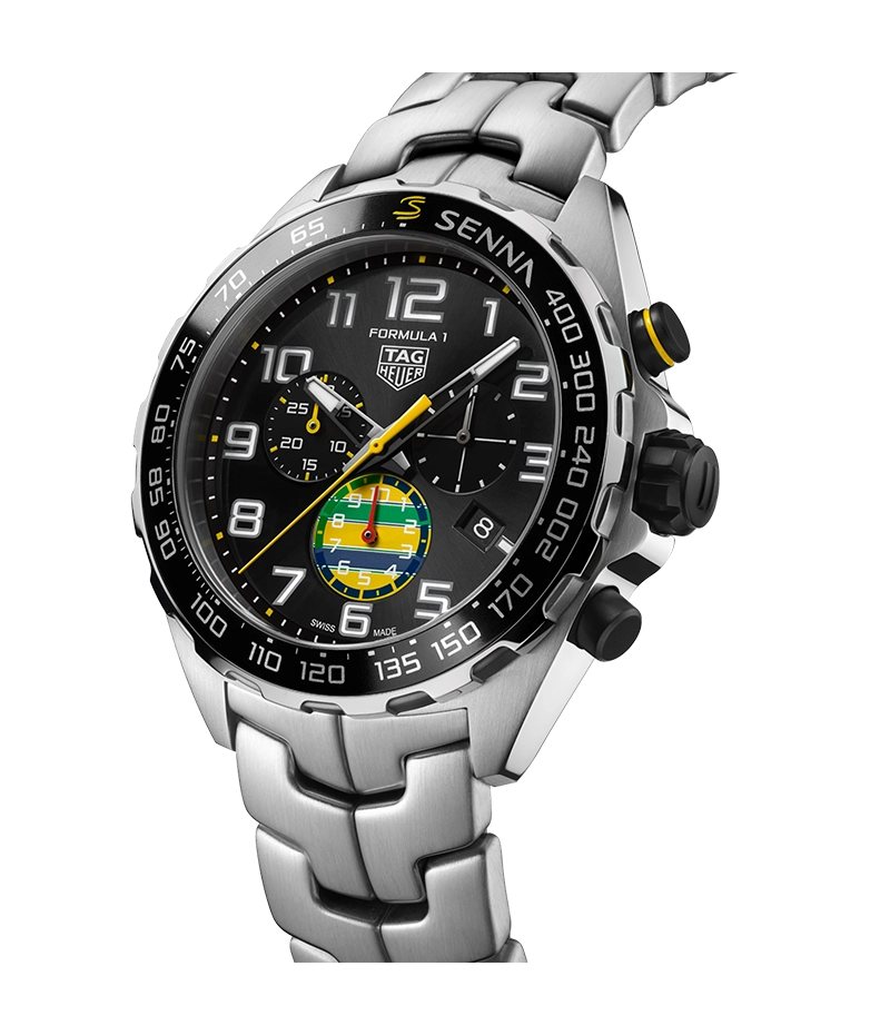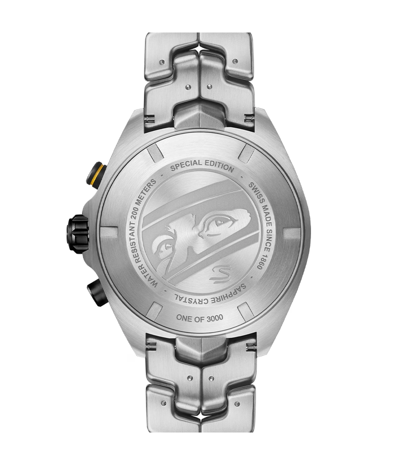 サテン & ポリッシュ仕上げを施した43mmのステンレススチール製ケースには、セナのロゴがあしらわれたブラックのアルミニウム製タキメーター付きベゼルが合わせられています。ステンレススチール製のねじ込み式ケースバックには特別な刻印が施され、タグ・ホイヤーとモーターレーシングのレジェンドとの強い絆を強調しています。
