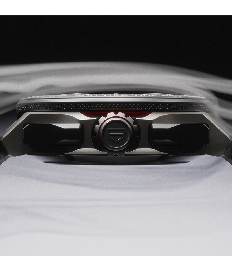 グレード2チタン製ケースは、サンドブラスト加工が施されたプッシュボタンとねじ込み式リューズを備え、より優れたしなやかさを実現。ブラックラバーストラップが快適な着用感と耐久性をもたらし、大胆なデザインを完成させています。