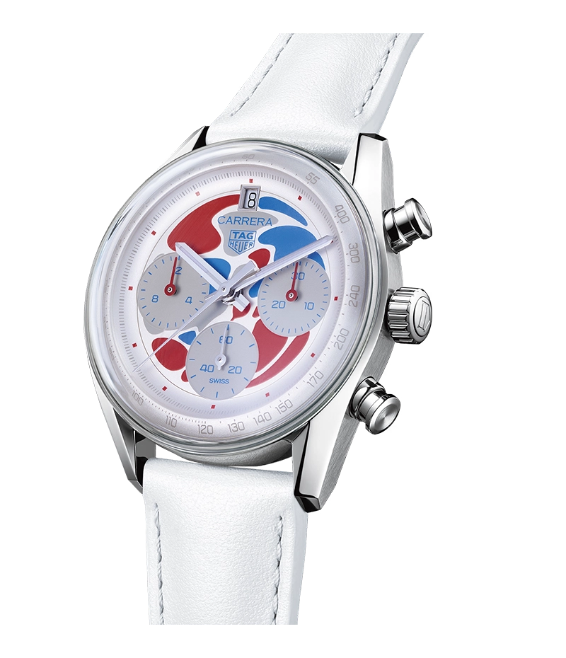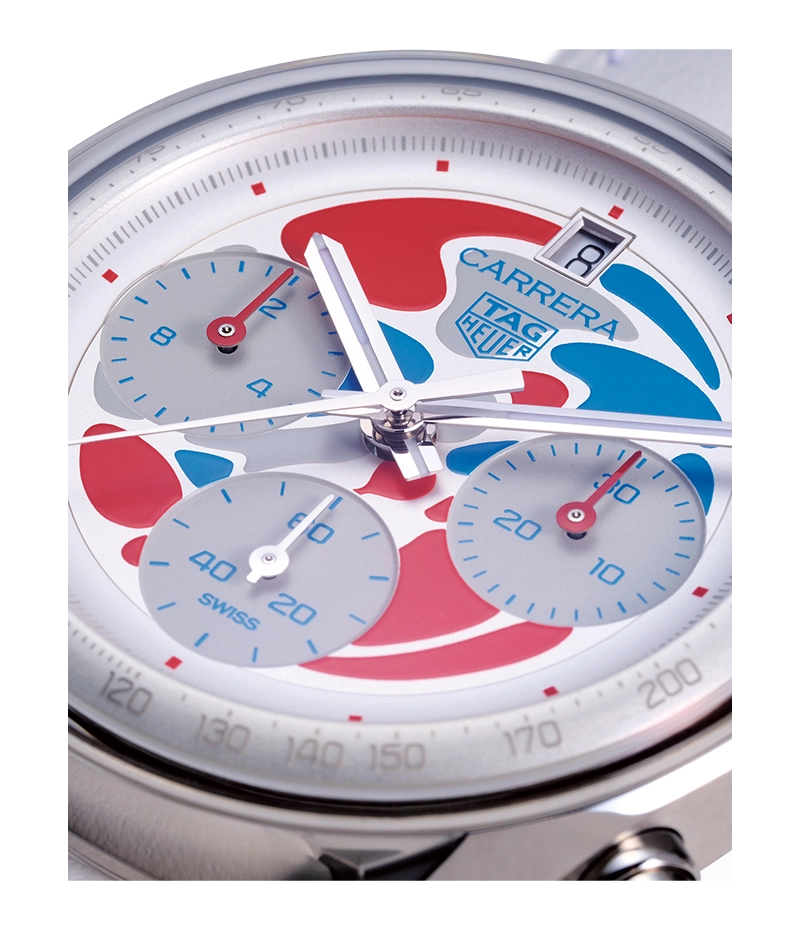 EXPO 2025 Design Systemのカラーパレットである、レッド・ブルー・グレーで描かれる生命感あふれるビジュアルデザインが39mmのホワイトオパーリンダイヤルに映えます。歴史、伝統、文化、世界とのつながりを脈々と未来へと受け継ぐというコンセプトと革新と進化を追い求めるタグ・ホイヤーのDNAと呼応します。