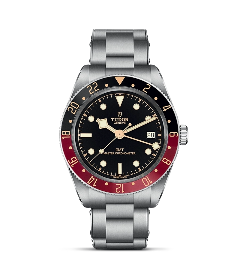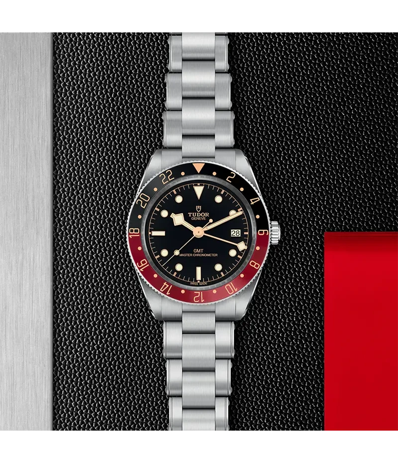 「ブラックベイ 58 GMT」は、チューダーの新しいミディアムサイズのGMT機能付き マニュファクチュール キャリバーを搭載し、バーガンディ、ブラック、そしてゴールドプレートの温かい色合いのベゼルが備えられています。ブラックベイ 58モデルの魅力的なケースが、ついにGMTにも導入されたのです。