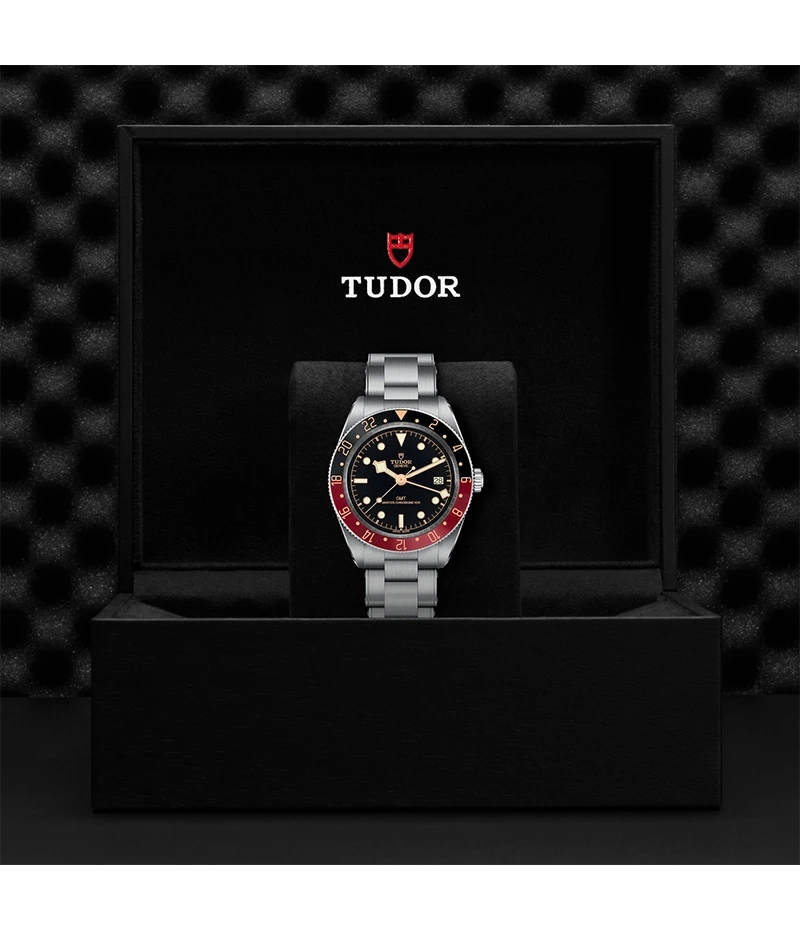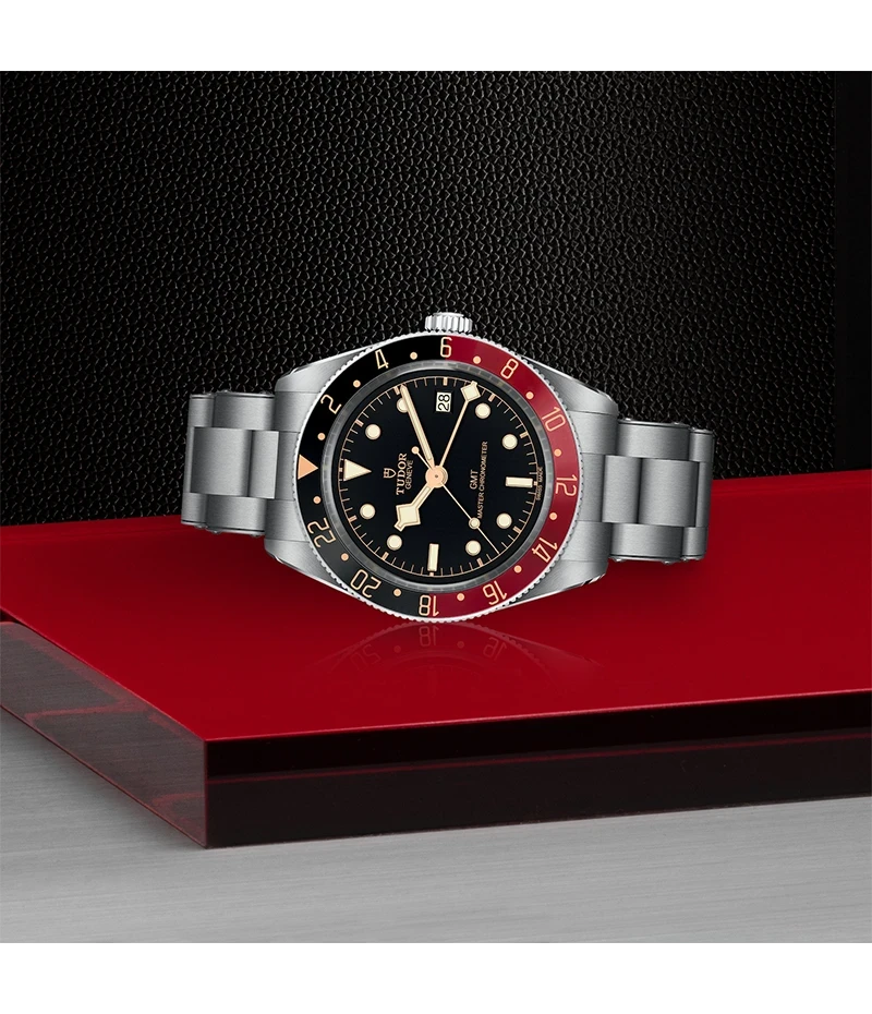 ベゼルはゴールドプレートの24時間目盛り付きのバーガンディとブラックで、ブラックベイ コレクションのデザイン言語を踏襲しています。このデザインは、チューダーが初めてダイバーズウォッチを製造したころと時を同じくして、ジェット機がタイムゾーン間をかつてないほど速く行き来するようになった時代を想起させます。