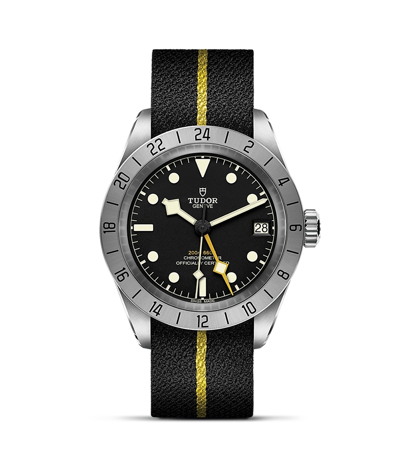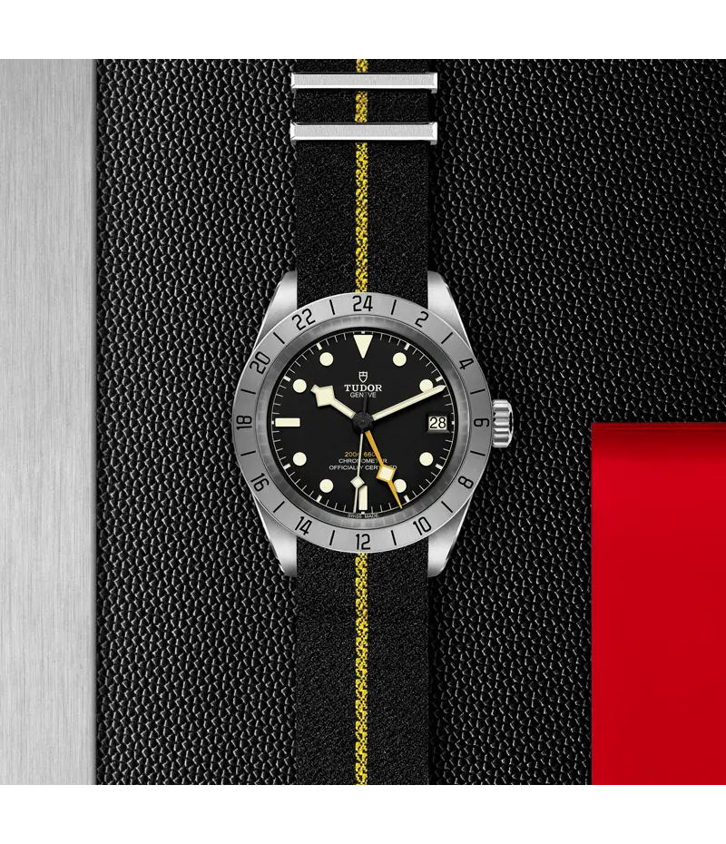 24時間目盛り付きサテン仕上げの固定ベゼルとイエローの細長い「スノーフレーク」針が存在感を放つブラックベイ プロは、GMT機能を組み込んだチューダー マニュファクチュール「キャリバーMT5652」を搭載しています。