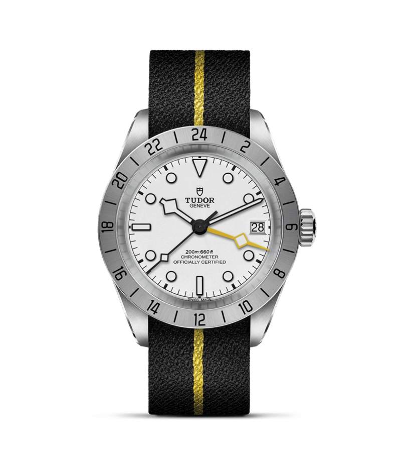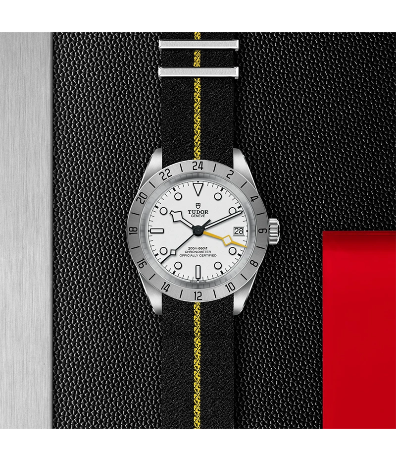 「ブラックベイ プロ」は、24時間目盛り付きサテン仕上げの固定ベゼルとイエローの細長い24時間表示の「スノーフレーク」針、GMT機能を組み込んだチューダー マニュファクチュール キャリバー MT5652を搭載した堅牢な時計です。