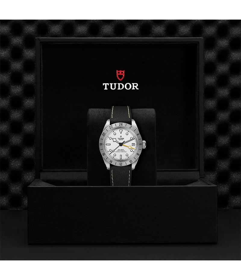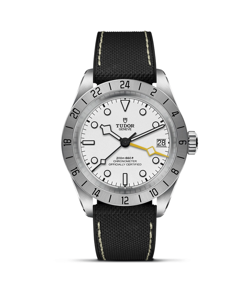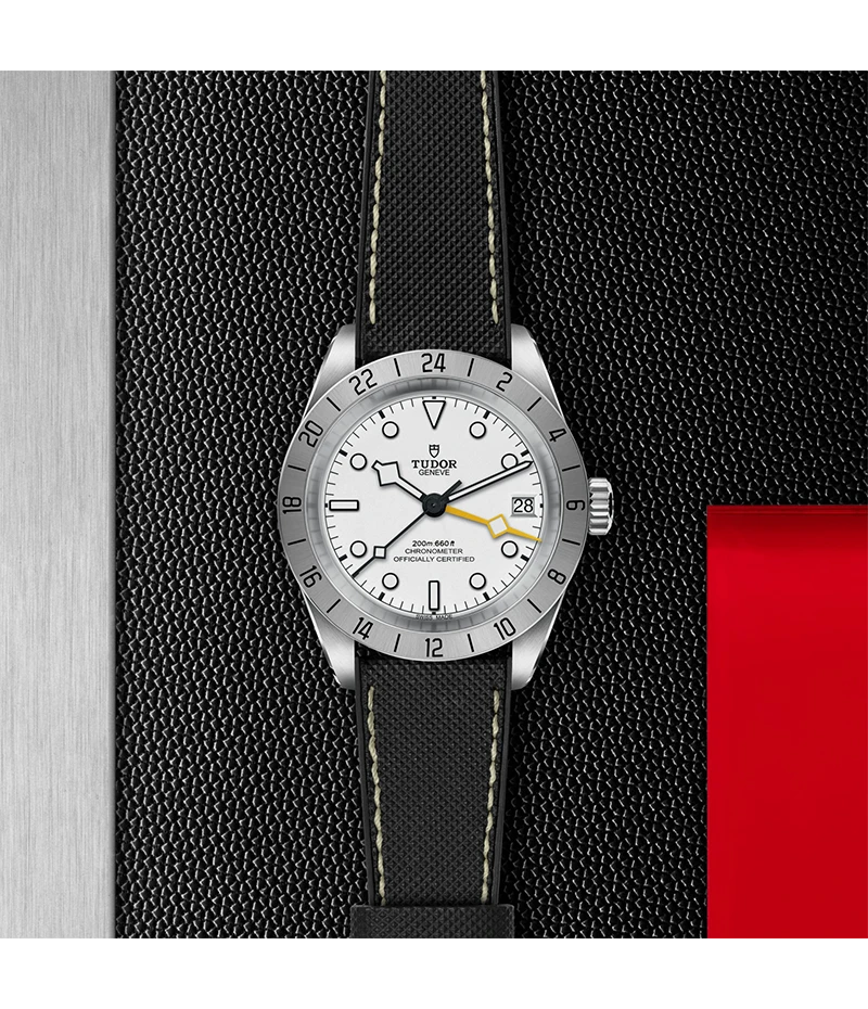 「ブラックベイ プロ」は、24時間目盛り付きサテン仕上げの固定ベゼルとイエローの細長い24時間表示の「スノーフレーク」針、GMT機能を組み込んだチューダー マニュファクチュール キャリバー MT5652を搭載した堅牢な時計です。