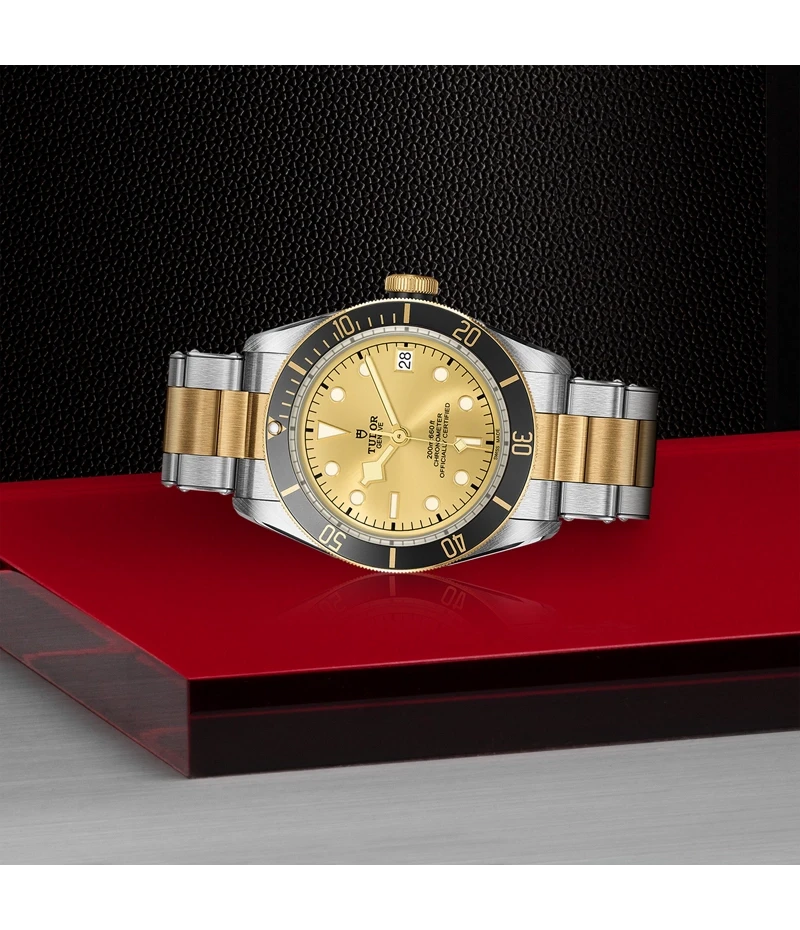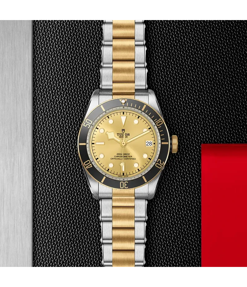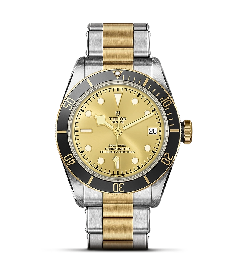 スチール&ゴールドを意味するS&Gと名付けられたブラックベイ。ドーム型ダイアルやクリスタルと同様に、全体的なフォルムは初期のチューダー ダイバーズウォッチに由来するものです。