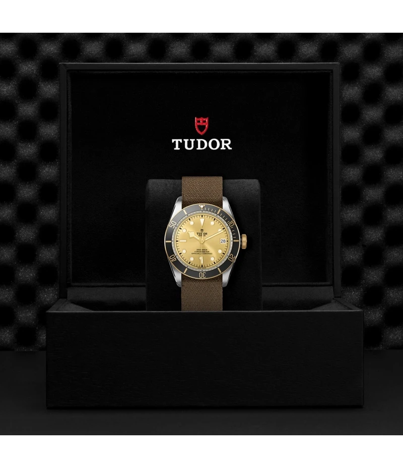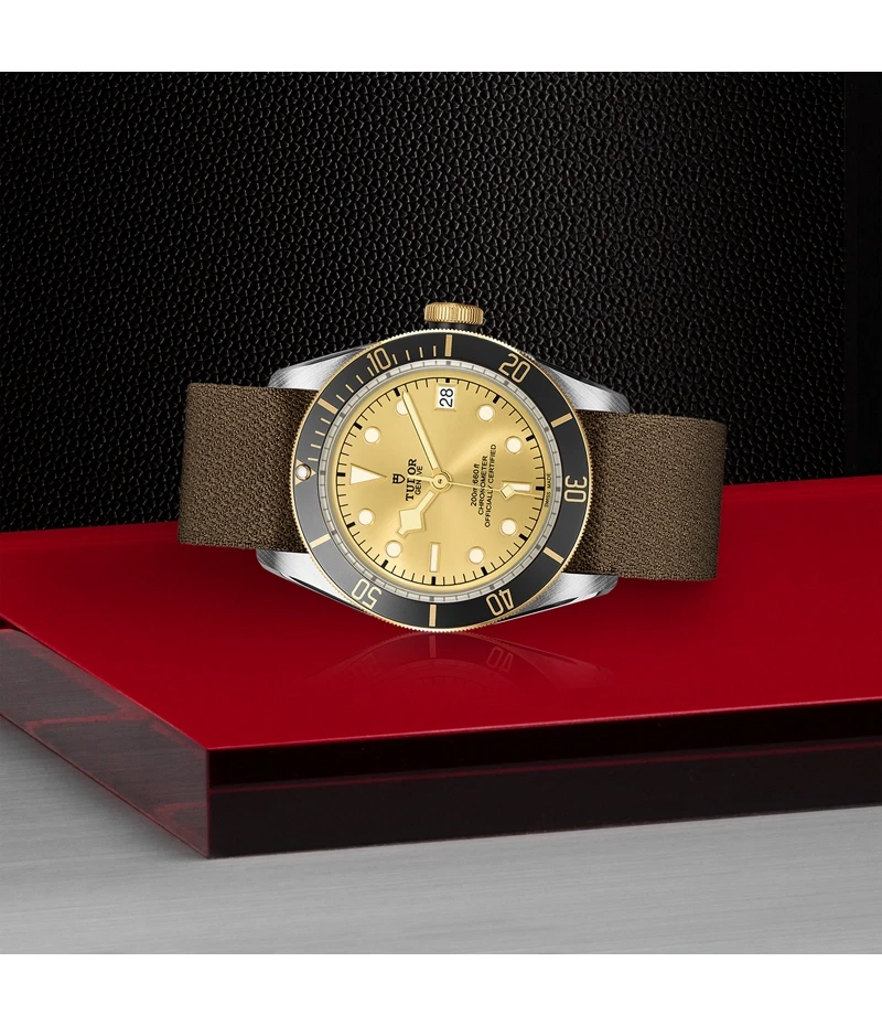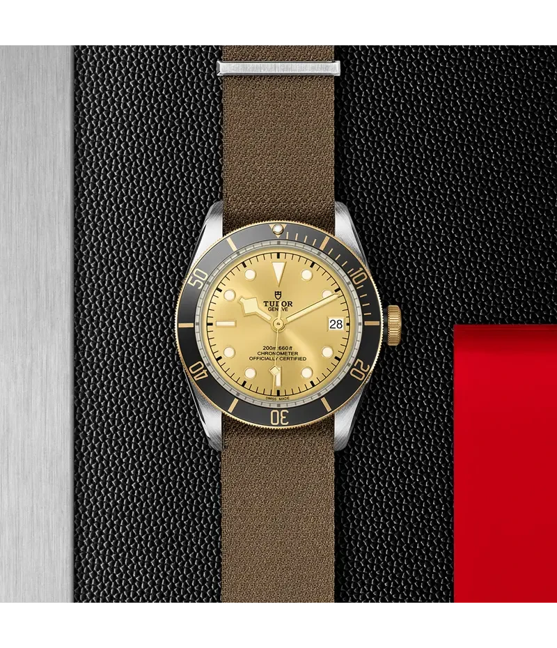 スチール&ゴールドを意味するS&Gと名付けられたブラックベイ。ドーム型ダイアルやクリスタルと同様に、全体的なフォルムは初期のチューダー ダイバーズウォッチに由来するものです。