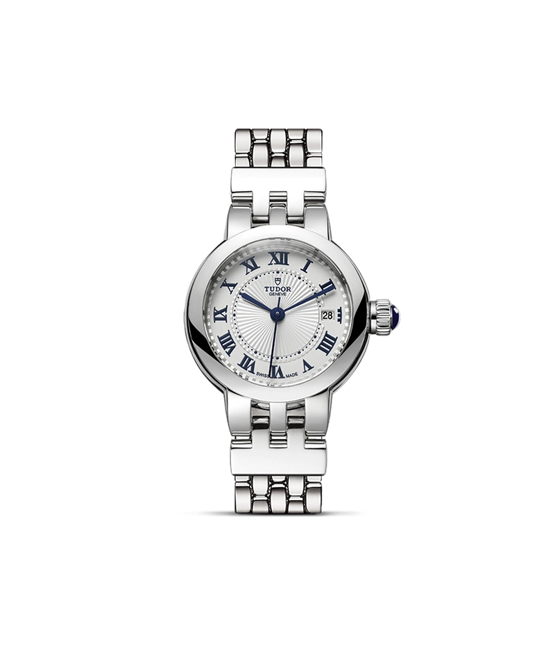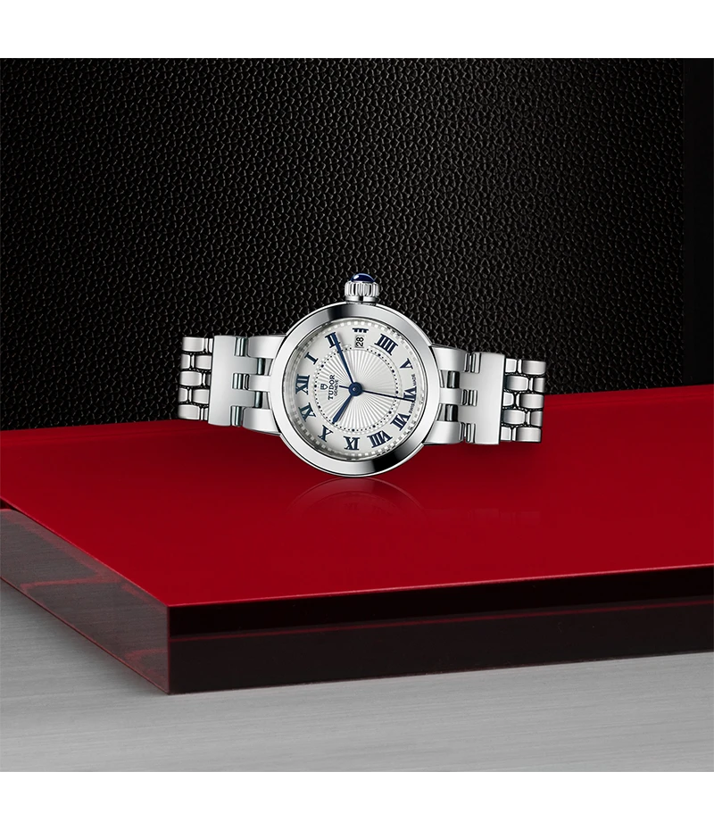 チューダー クレア ドゥ ローズは、繊細さと大胆さを兼ね備えたスタイルが特徴の、女性らしさ溢れるモデルです。それは数々のタイムピースが作り上げてきたブランドの伝統に敬意を表したものです。直径26mm、30mm、34mmの3サイズ展開で、浮き彫りの繊細な装飾が施されたオパラインダイアルを備えており、ブルーに艶出しされたローマ数字またはダイヤモンドを使ったインデックスが刻まれています。クレア ドゥ ローズは日付表示機能付き自動巻きムーブメントが搭載されます。