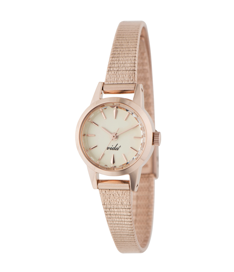 時計本来の機能とシンプルさを追求し、様々なシチュエーションに対応できるモデルとして生まれたV-006シリーズ。柔らかなカットガラスだけを引き立たせ、バンドとケースはゴールド、ピンクゴールド、シルバーのメタルブレスに加え、本リザードを使用した事により、また違った雰囲気を堪能できます。